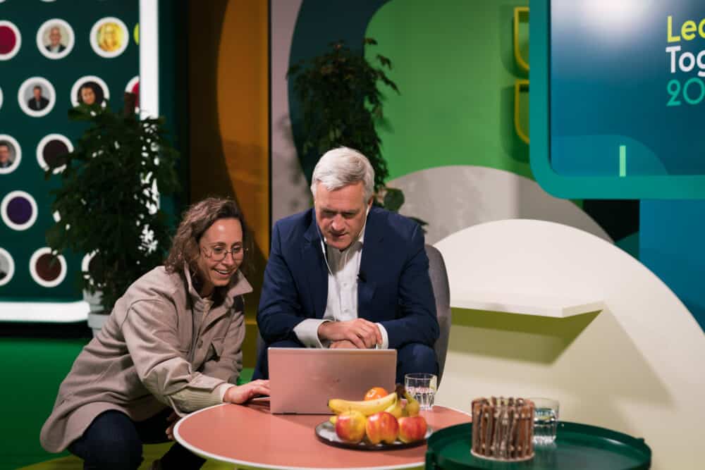 Samen met Unlimited Productions creëerden we een dynamische online studio met meerdere settings, speciaal ontworpen voor dit event. Een verticale social check-in wand bracht de community visueel tot leven. Het programma kende een strak ritme van keynotes, games, challenges en prijzen. Van interactieve polls tot spontane shout-outs: elke minuut telde. Leading Together was geen livestream, maar een volwaardige digitale beleving die voelde als live.