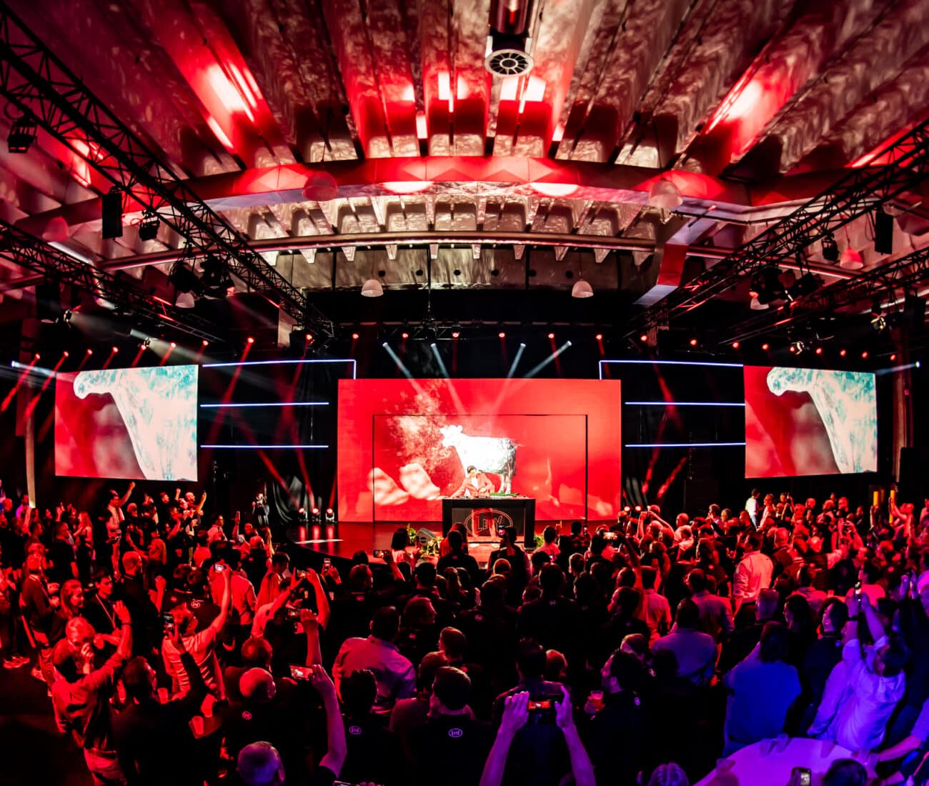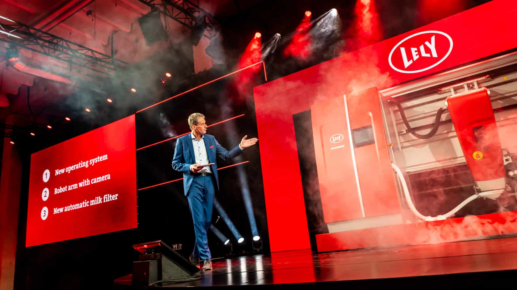 Twee grote schermen boden verschillende perspectieven op het verhaal, terwijl hoge LED deuren in het midden Lely’s rol als verbindende schakel symboliseerden. Elke keer dat die deuren openden, volgde een productlancering waarin storytelling en spektakel elkaar versterkten.